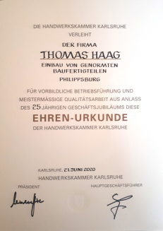 Die Firma Thomas Haag – Einbau von genormten Baufertigteilen – war somit geboren und wurde am 21. Juni 1995 in die Handwerksrolle der Handwerkskammer Karlsruhe eingetragen.
